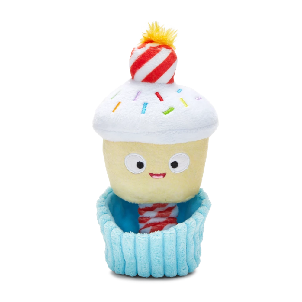 This friendly, crinkly cupcake has a squeaky spiky ball core, and a springy bungee for a sweet game of tug. Sneak a treat into the crackling crinkle cup for an extra tasty play sesh!