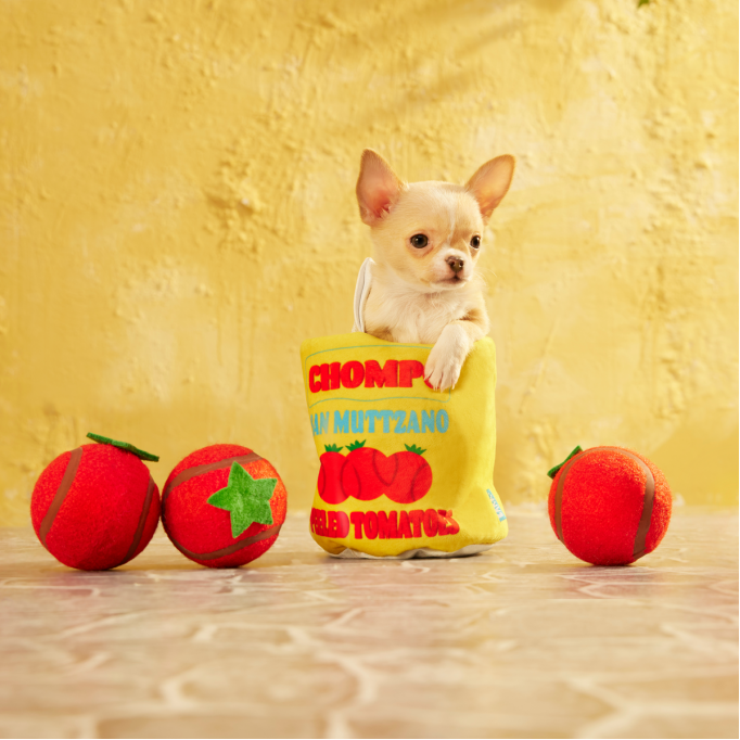 Your pup can hit the sauce hard with this multi-part toy. Dig into the crazy crinkle can (a paw-opener usually works best) and pour out the three squeaky tennis balls. Throw them for a game of fetch, or give them a roll and watch your dog try to ketchup. Toss some treats or kibble in the can to add a natural sweetner to this playtime recipe.