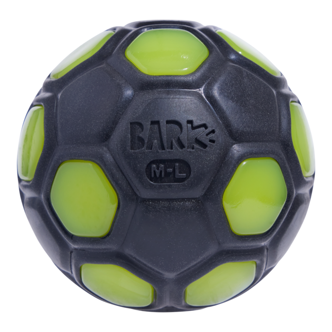 Get your champ chomping with this treat-dispensing toy! Made with two types of rubber for increased enrichment, this toy also glows in the dark for late night games of fetch. Add some treats or kibble if a tasty playtime is your dog's GOOOOAAALLLL! *Not recommended for serious chewing.